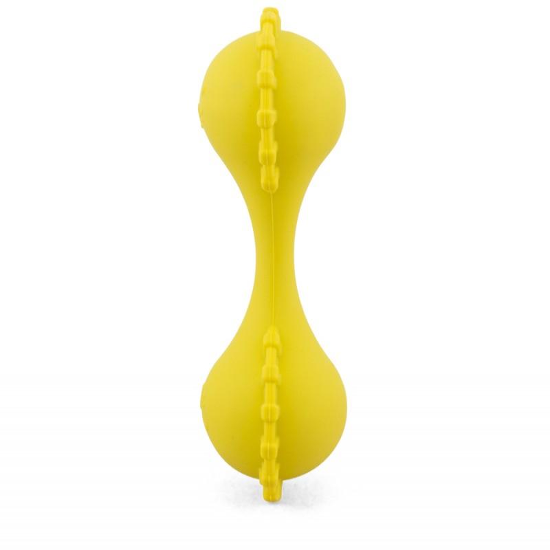| Hochet en forme de maracas double en silicone souple et facile à prendre en main par les tout-petits.  Lorsque l'enfant manipule son hochet, il émet un bruitage discret pour distraire Bébé sans le faire sursauter. À offrir dès le premier âge. Dimension : 4.5 X 4.5 X 15 cm.