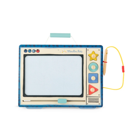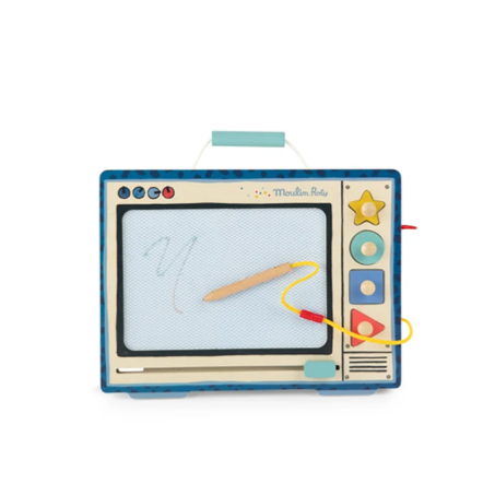 La télé ardoise magique de Puce & Pilou laisse place à la créativité, munie d'une réglette et de tampons,