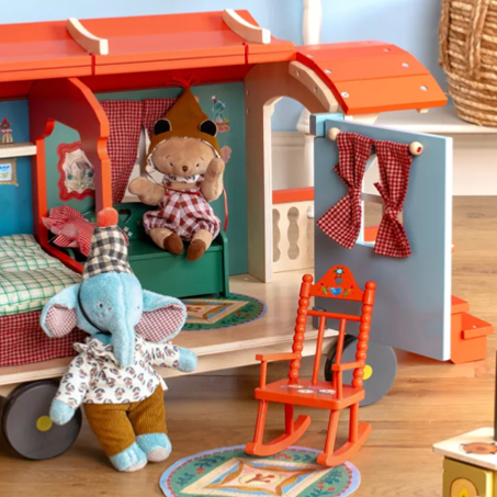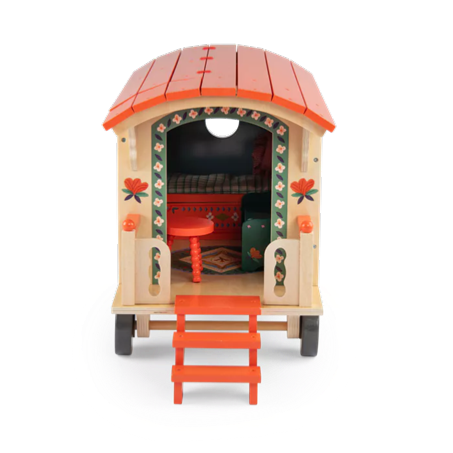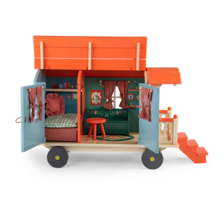 Joliment décorée, la roulotte des Minouchkas accueille tous les personnages de la famille. Elle est meublée d'un lit avec sa couette et son oreiller, d'une banquette et d'une petite table. Les personnages sont vendus séparément.