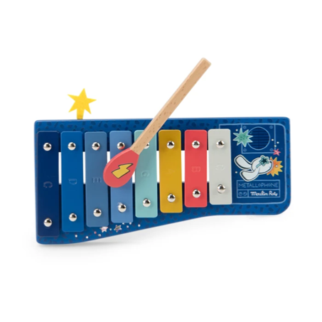 |  Métallophone multicolore de 8 tons, le socle est en bois et sa mailloche est en forme d'allumette.