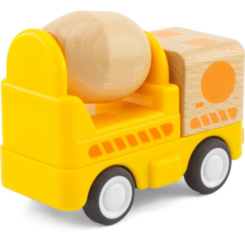 |  Dans la gamme Routoudou, voici le mini camion toupie, véhicule de chantier robuste et amusant, fabriqué avec des matériaux de qualité, bois et plastique durable, il roule en le poussant ou à rétro friction, les pneus sont munis de caoutchouc et en appuyant sur le véhicule, les phares s'allument et trois sons différents de chantier se déclenchent.