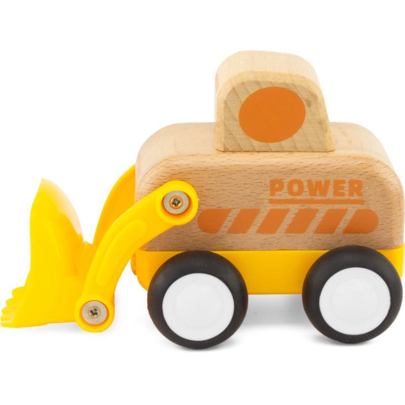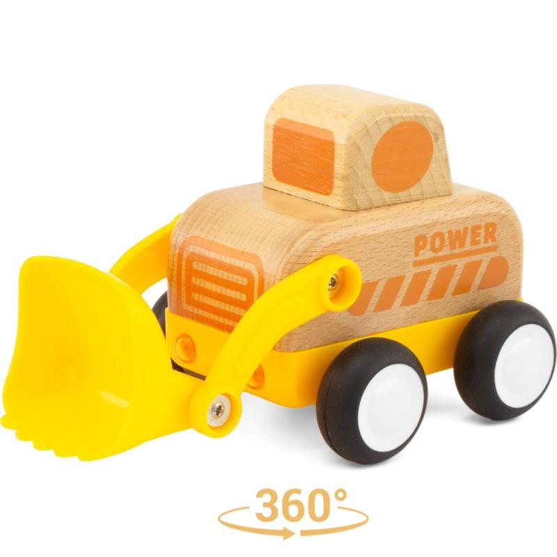 Dans la gamme Routoudou, voici le mini chargeur, véhicule de chantier robuste et amusant, fabriqué avec des matériaux de qualité, bois et plastique durable, il roule en le poussant ou à rétro friction, les pneus sont munis de caoutchouc et en appuyant sur le véhicule, les phares s'allument et trois sons différents de chantier se déclenchent. Fonctionne avec trois piles LR44 1.5 V incluses. À offrir à des enfants de plus de 18 mois. Livré dans une boîte kraft.